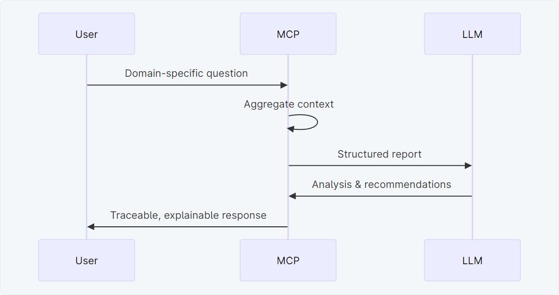 These data are not visualized, but interpreted. An MCP server prepares them in a structured way and provides them to an LLM. The model does not take control — it performs analysis.